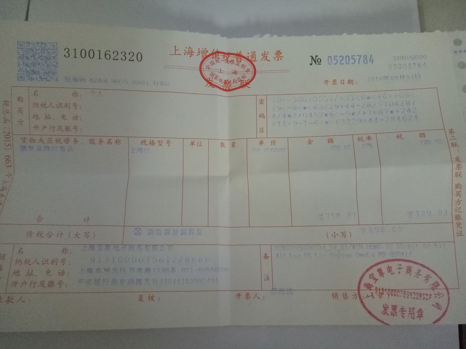 在购买时,我甚至没有要求开发票,然而一个快递公司却通过快递送件上门的形式,把发票送到我家门口,发票上的软件密钥,跟我购买时,在网上看到并自己抄写下来的密钥,相同
